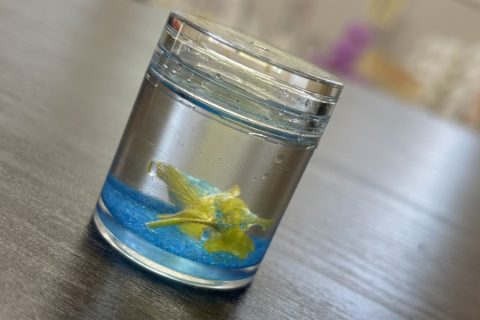 花ビラなどを小瓶の中に入れ専用の液体と混ぜて制作する簡単できれいなインテリアを制作します。